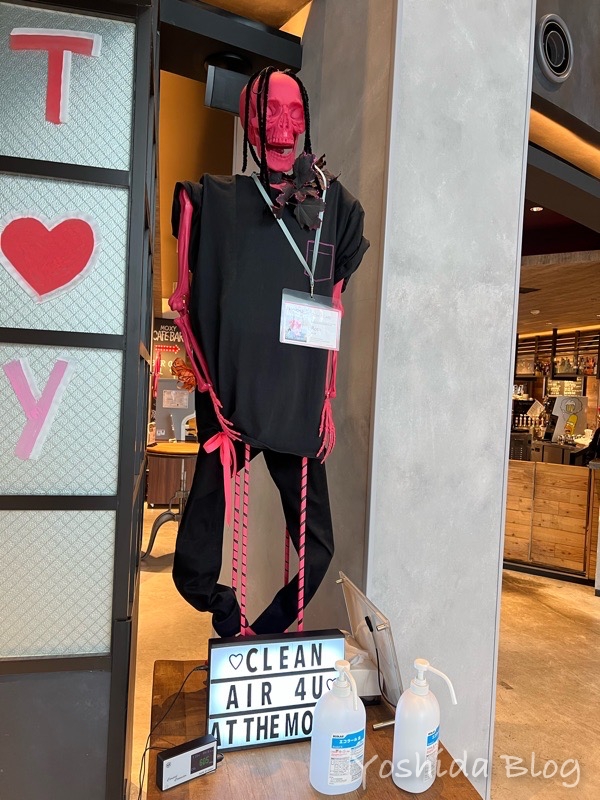 ホテル入口では、ガイコツのスタッフ ローザちゃんがお出迎えです。
