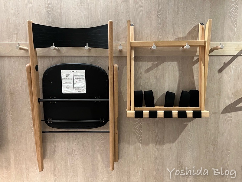 テーブルや椅子も壁にかけられていていい感じ。